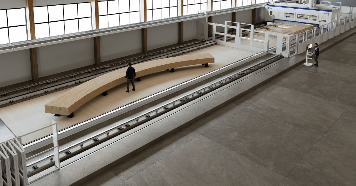 Making its debut at Dach+Holz International is the latest addition to SCM’s range of solutions for timber construction: “area gl”, a five-axis CNC machining center designed for the production of straight and curved glued-laminated timber elements intended for roofs of public buildings, multi-storey buildings, and infrastructure projects.
