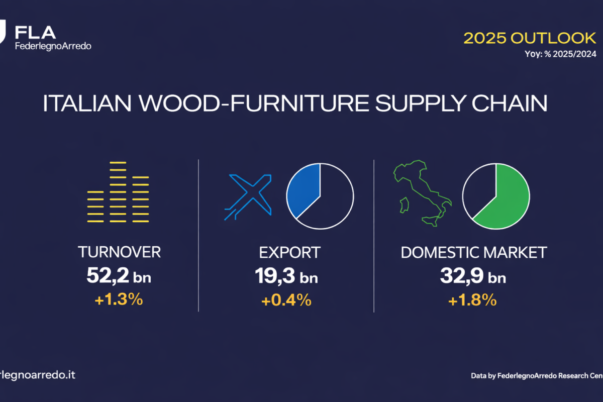 Despite a still uncertain macroeconomic environment, the Italian wood-furniture supply chain closed 2025 with growth. Production turnover reached €52.2 billion, up 1.3 percent compared to 2024, driven mainly by the resilience of the domestic market, which grew by 1.8 percent to €32.9 billion. Exports remained broadly stable (+0.4 percent), amounting to €19.3 billion, despite signs of weakness in key markets such as France and the United States, partly offset by an improvement in Germany. These figures emerge from the 2025 preliminary estimates prepared by the Research Centre of FederlegnoArredo, presented at the launch press conference of the April edition of the Salone del Mobile.Milano.