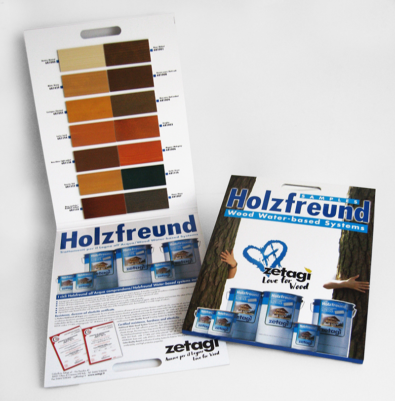 Il produttore di vernici Zetagì ha realizzato una nuova versione del campionario dei cicli “Holzfreund” all’acqua rendendo il più verosimile possibile la percezione del risultato finale. Il nuovo campionario infatti contiene 14 tasselli di legno trattati con gli impregnanti della serie “681” che vanno dal neutro “681000” ai colorati nelle varie tonalità: Miele “681429”, “Castagno 681005”, “Larice 681194”, “Noce chiaro 681128”, “Quercia 681322”, “Noce rossiccio 681125”, “Noce 681001”, “Rovere scuro 681008”, “Douglas 681002”, “Mogano 681006”, “Ebano 681007” e “Verde 681116”. I campioni riproducono nella maniera più reale il risultato ottenibile ma nel momento dell’applicazione effettiva le proprietà del substrato e l’umidità del legno potranno influenzare la resa del prodotto. Vista la grande diffusione nel mercato internazionale il campionario è stato realizzato sia in italiano che in inglese.