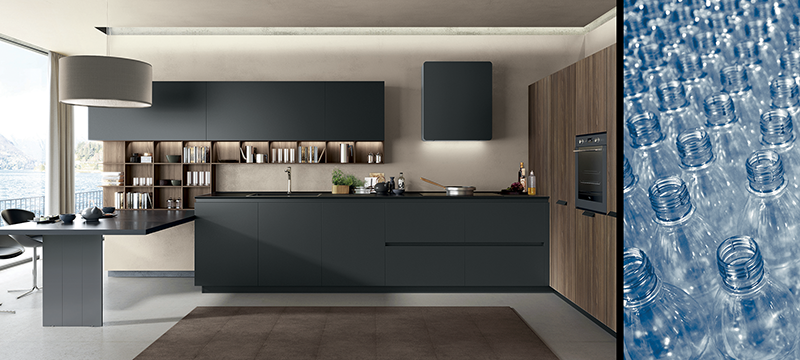 Continua l’impegno del Gruppo Euromobil nella ricerca di materiali all’avanguardia in grado di ridurre l’impatto ambientale e soddisfare l’esigenza di “green design”. Oggi l’impresa veneta propone cucine rivestite con “Respet®”, la rivoluzionaria pellicola in pet riciclato che viene dalle comuni bottiglie in plastica. Una scelta che si traduce in un processo di produzione che non impiega combustibili fossili e consente la riduzione di emissioni di Co2 del 60 per cento.