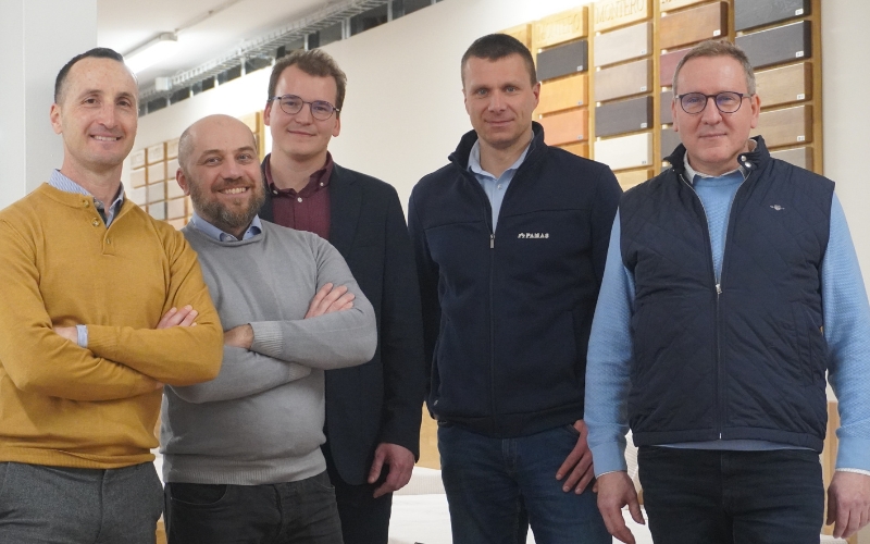 Da sinistra: Federico Bonazelli (area manager Scm Group), Marco Battilani (process&sales manager Scm Group), Vladimir Kubeš junior, Jan Mimra (Panas, rivenditore Scm Group in Repubblica Ceca) e Vladimir Kubeš, il fondatore di Intermont.