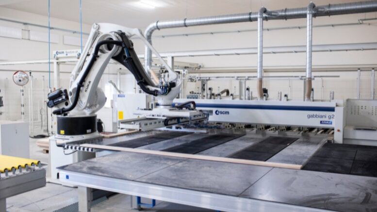 A partire dall’ingresso della materia prima (ma sarebbe meglio dire “seconda”), pannelli di legno massiccio che vengono avviati a una levigatrice-calibratrice “dmc eurosystem” da un sistema che garantisce una spinta costante, così da ottenere la migliore precisione possibile. Un robot provvede poi ad accatastare ogni singolo pannello prima di avviarlo – sempre grazie a sistemi robotizzati – alle due linee di sezionatura, una delle quali rappresenta l’investimento più recente affidato alla funzione engineering di SCM: una cella integrata in grado di lavorare in assoluta autonomia per due turni, il cui cuore è una “gabbiani g2”, asservita da un magazzino intelligente “flexstore elr” e da un accatastatore verticale in uscita, oltre che da robot di carico e scarico e trasportatori automatici “agv”.