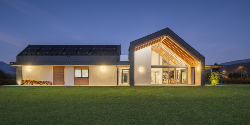 Dal punto di vista costruttivo e impiantistico, Villa ai Filari rappresenta un esempio maturo di architettura sostenibile e ad alte prestazioni. La struttura in legno a telaio è isolata con fibra di legno e sughero, mentre le finestre in legno-alluminio offrono ottima tenuta termica all’aria. La copertura asimmetrica ospita pannelli fotovoltaici integrati, orientati in modo da massimizzare la produzione. L’energia viene stoccata in batterie e utilizzata per alimentare una pompa di calore aria-acqua, la ventilazione meccanica controllata, la produzione di acqua calda sanitaria e le colonnine per veicoli elettrici.