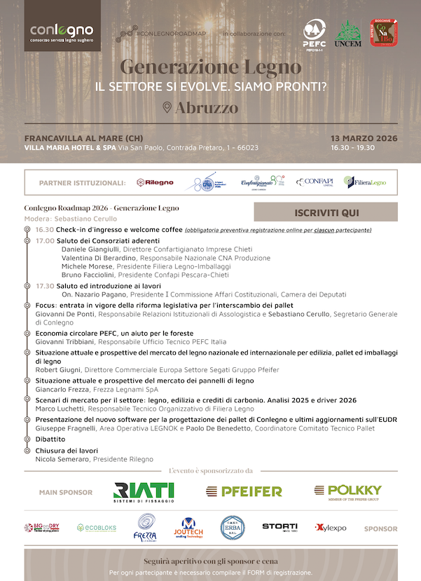 Il settore del legno sarà al centro di un momento di confronto e approfondimento sulle sfide che attendono la filiera con “Generazione Legno – Il settore si evolve. Siamo pronti?”, tappa abruzzese della Conlegno Roadmap 2026. L’evento è in programma venerdì 13 marzo 2026, dalle 16.30 alle 19.30, a Francavilla al Mare (CH), presso il Villa Maria Hotel & Spa.