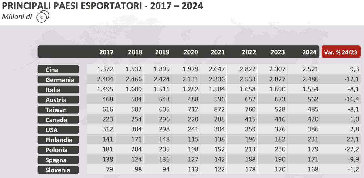Un dato, il distacco dalle prime tre posizioni al resto della classifica, che appare evidente dalla tabella 1, che mostra anche l’avanzata cinese – che vive un momento di riflessione nel solo 2023, passando dai 2,82 miliardi del 2022 a 2,30 – a confronto con la sostanziale stabilità tedesca e italiana. Forte, come accennavamo, il distacco dalle inseguitrici, Austria e Taiwan in primis, che arrivano a un terzo delle esportazioni italiane e a un quinto rispetto alla prima della classe.