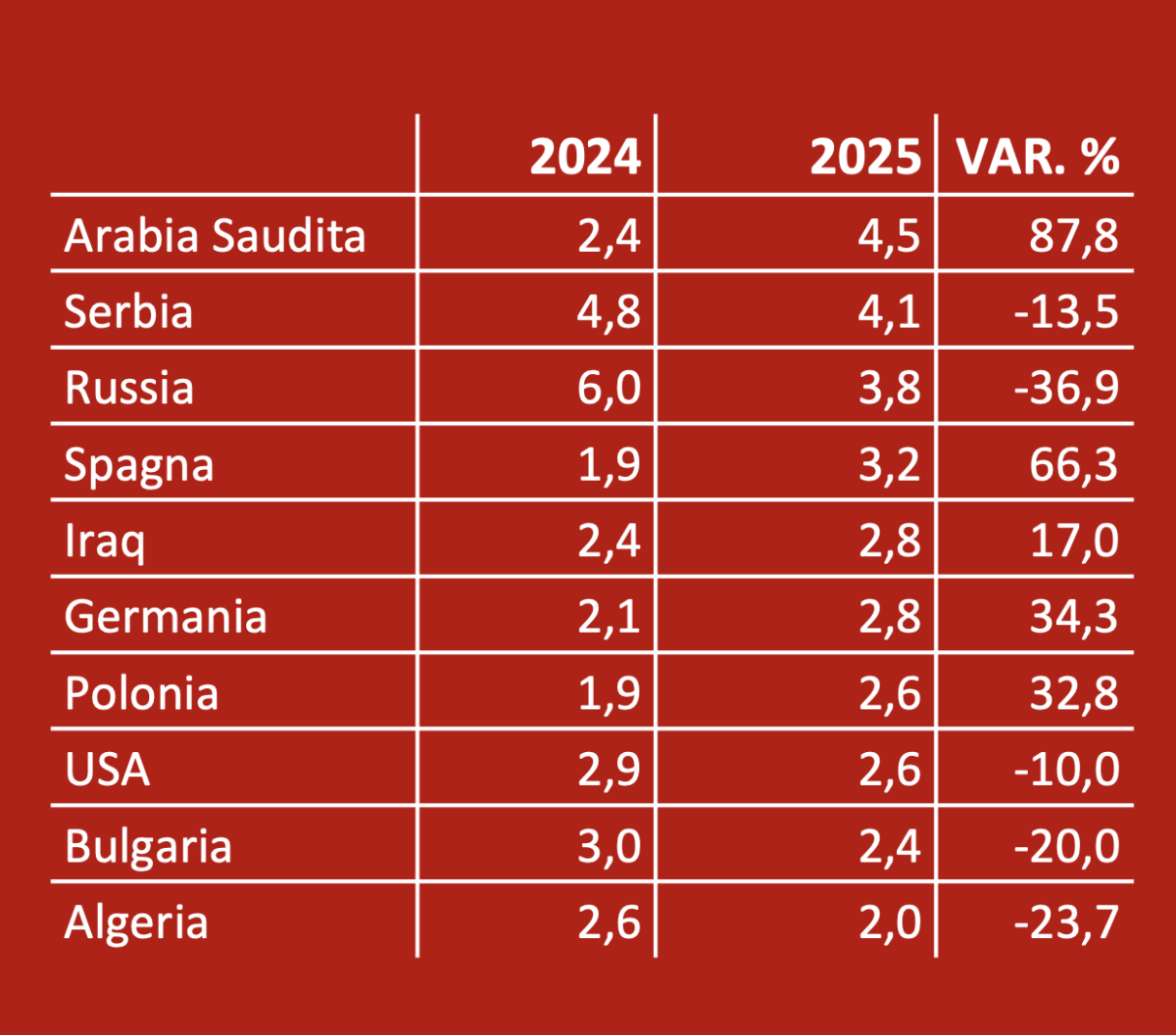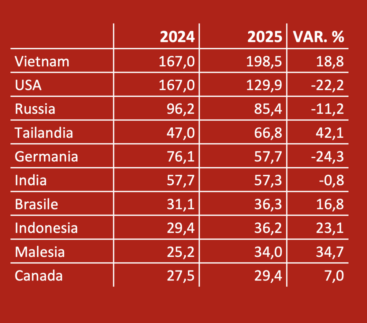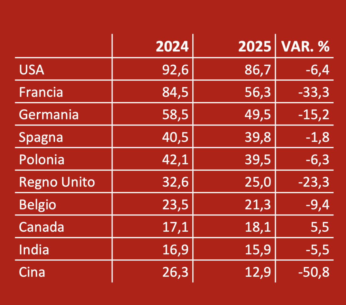 Anche l’export della Germania nel periodo gennaio-giugno 2025 perde quota, passando da 1.219 milioni dei primi sei mesi 2024 a 1.110 (meno 8,9 per cento). Ancora più significativa la contrazione dell’Italia, che rappresenta pur sempre il 13 per cento dell’export mondiale ma passa dai 780 milioni del primo semestre 2024 ai 641 dello stesso periodo 2025, con un calo del 17,8 per cento.