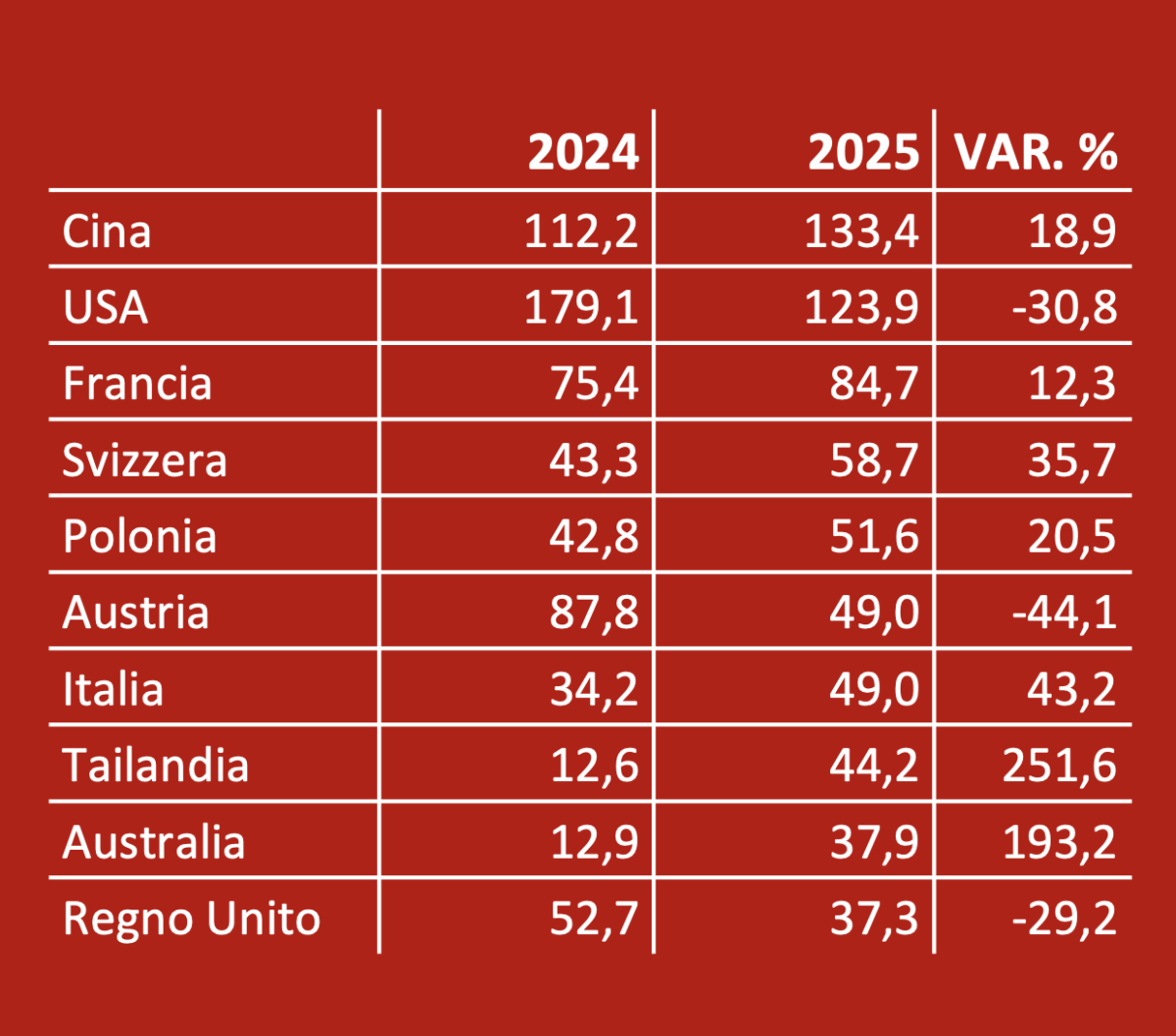 La Germania (tabella 4) mantiene un certo dinamismo, nonostante una stagione economica pesantemente condizionata dagli interrogativi che stanno coinvolgendo l’industria automobilistica e, di conseguenza, tutti gli altri settori. Le esportazioni nel periodo gennaio-giugno 2025 sono cresciute in modo generalizzato: bene le vendite in Cina (133 milioni contro i 112 del 2024, più 18,9 per cento) e in Italia (più 43,2 per cento); benissimo, in termini percentuali, in Tailandia e Australia. Meno fortuna negli Usa (meno 30,8 per cento) e nella pur vicinissima Austria (meno 44,1 per cento).