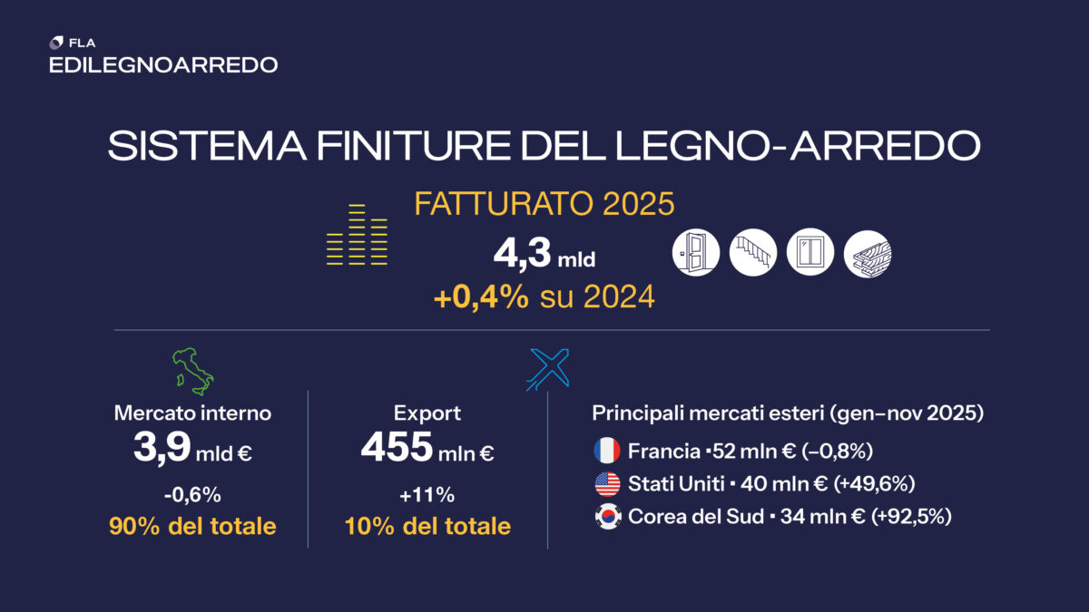 Nel 2025 il fatturato alla produzione del Sistema Finiture per edilizia si attesta complessivamente a oltre 4,3 miliardi di euro (più 0,4 per cento sul 2024). Il mercato nazionale, che rappresenta il 90 per cento del totale, si mantiene sostanzialmente stabile (meno 0,6 per cento) per un valore di circa 3,9 miliardi di euro, nonostante il ridimensionamento degli incentivi fiscali. In aumento le esportazioni, che raggiungono i 455 milioni di euro (più 11 per cento), con performance positive in tutti i comparti e particolare dinamismo per porte interne e pavimenti in legno. La Francia si conferma primo mercato estero per le finiture per edilizia (52 milioni di euro nel periodo gennaio-novembre 2025). Crescono gli Stati Uniti, che diventano la seconda destinazione, mentre la Corea del Sud si conferma primo mercato per i pavimenti in legno. In forte calo le esportazioni verso la Cina, che esce dalla top ten, sostituita dagli Emirati Arabi Uniti.