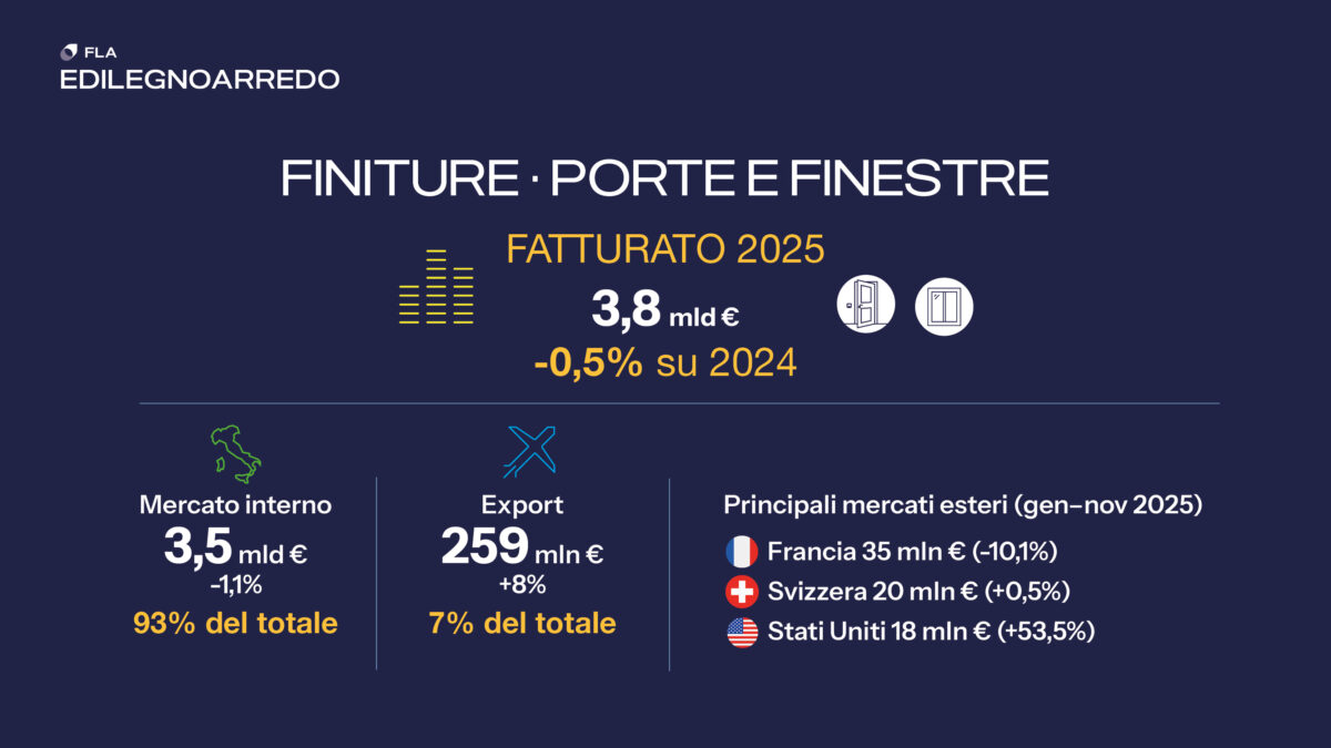 Stabile il fatturato (meno 0,5 per cento) alla produzione delle imprese di Finestre di legno e legno-alluminio, Porte interne e porte d’ingresso che chiude il 2025 a poco meno di 3,8 miliardi di euro.  Il mercato di riferimento è l’Italia, in lieve flessione (meno 1,1 per cento) cui viene destinato il 93 per cento della produzione. In crescita anche le esportazioni (più 8 per cento) che sfiorano i 260 milioni di euro. La Francia, nonostante la flessione più marcata, si conferma la prima destinazione dei prodotti italiani, seguita da Svizzera e Stati Uniti.